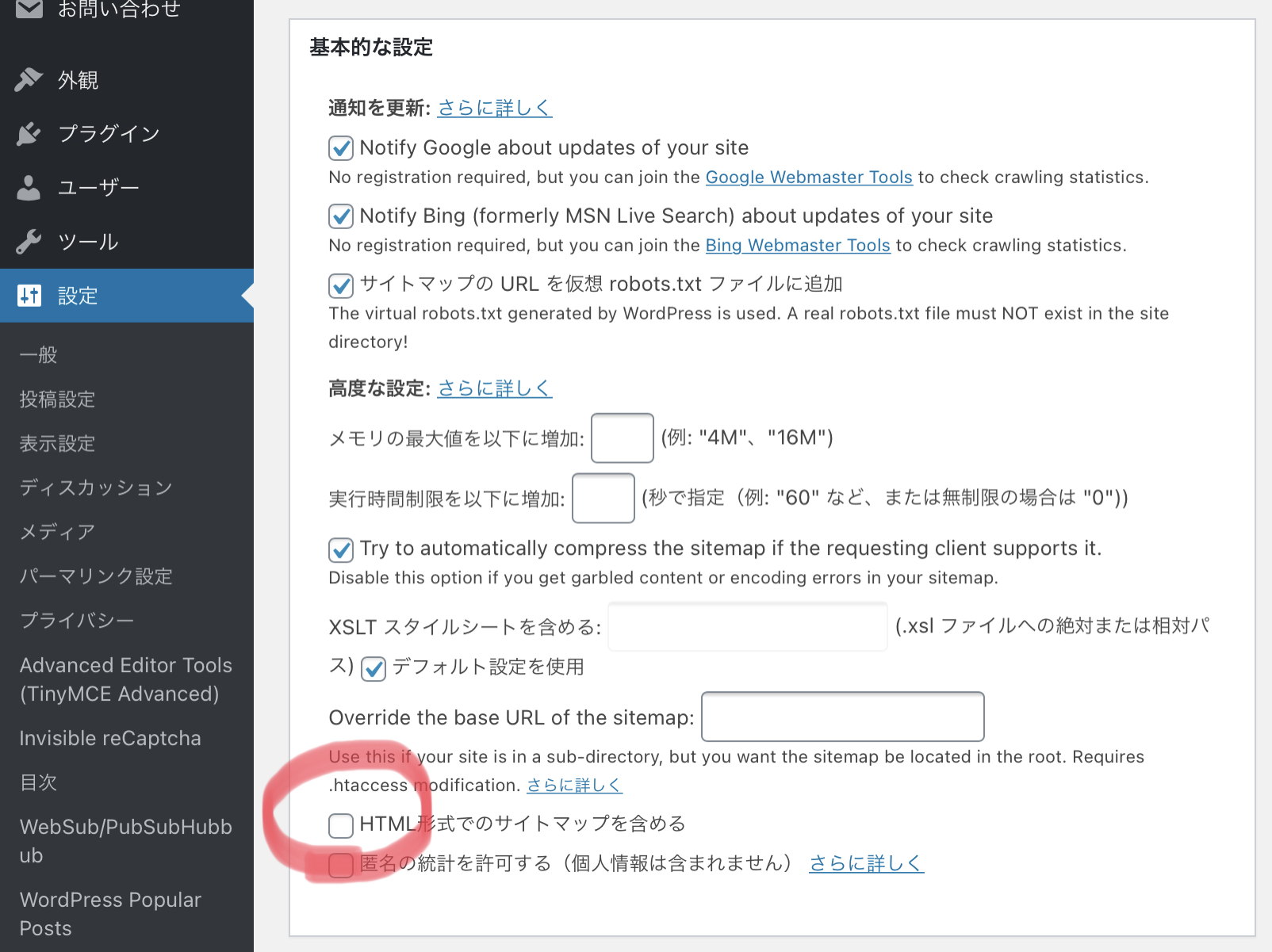 2.HTML形式でのサイトマップを含めるを確認